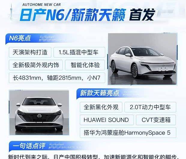 日產N6作為品牌第二款新能源戰略車型,定位插電混動中型轎車。新車基于天演架構打造,配備21.1kWh電池組,CLTC工況純電續航預計超過150公里。車身尺寸為4831/1885/1491mm,軸距2815mm。動力系統搭載1.5L自然吸氣發動機與電動機組成的插混系統,其中發動機最大功率75千瓦。外觀采用星環式貫穿燈組設計,內飾延續極簡風格并配備懸浮式中控屏。