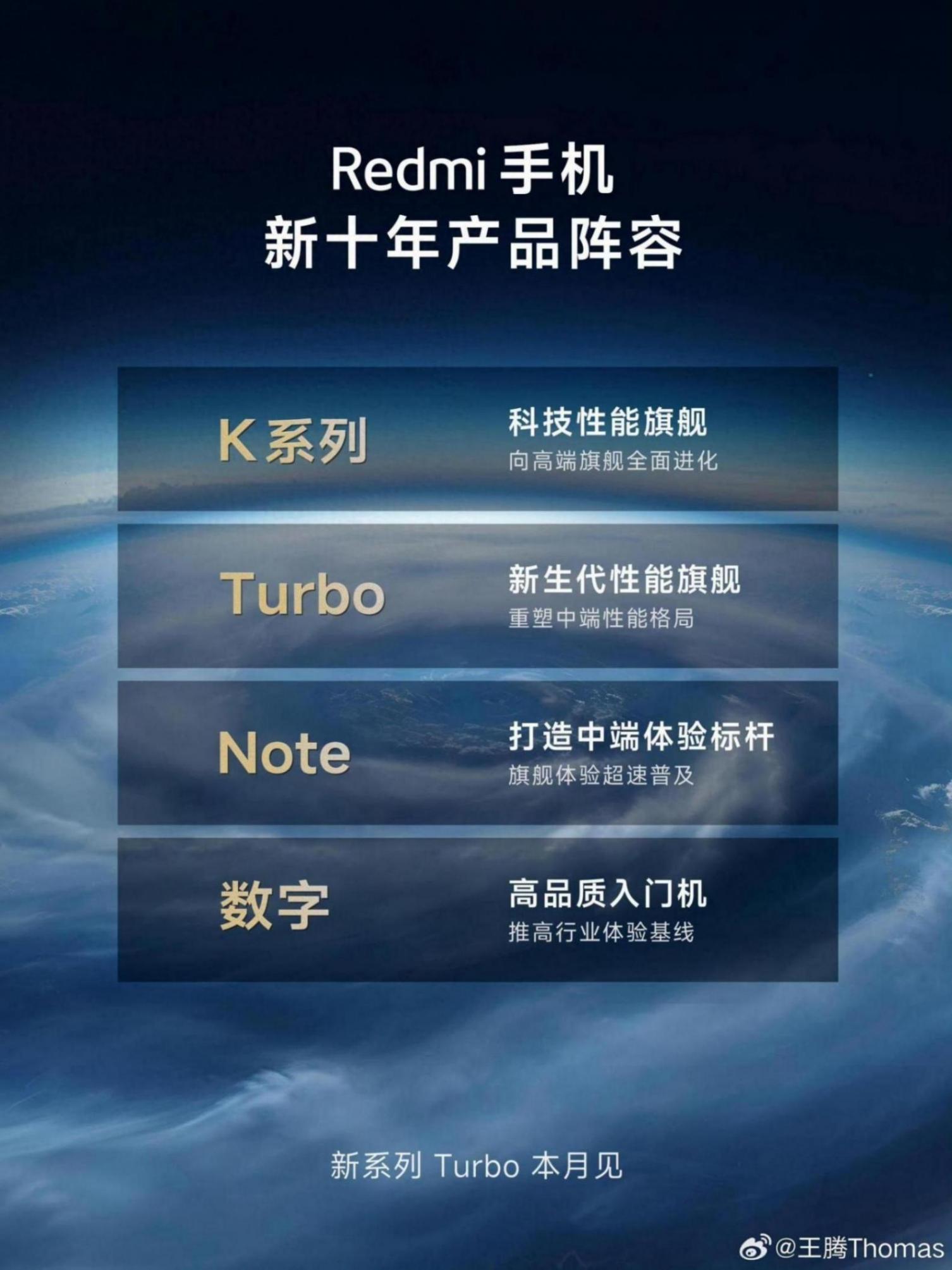 今日,Redmi手機產品經理王騰在個人社交賬號中公開了「Redmi新十年產品陣容」,除了早前已有消息泄露的「Turbo」系列之外,數字系列、Note系列和K系列均有相應的調整。